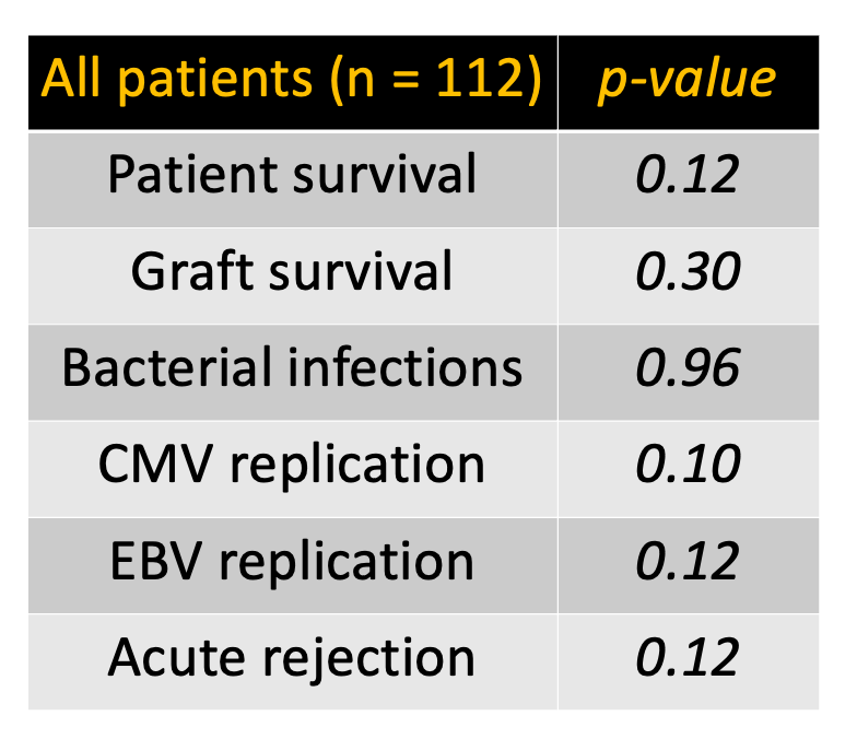 Results: 97 patients from 4 centers were recruited (Group A n= 52, Group B n= 25, Group C n= 20). Proportion of living donors were similar (p=0.93). No differences in rejection (p=0.12), CMV (p=0.10) or EBV (p=0.12) replication, nor other viral or bacterial infections (p=0.96) were noted. Patient (p=0.12) and graft (p=0.30) survival were similar (Table ). Results were similar among biliary atresia except for CMV replication, more frequent in group B when compared to Group C (p=0.04). Patient and graft survival were 100% in all groups.