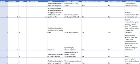 Conducted a single center, retrospective review, to analyze pediatric patients with CTPV who have undergone or are candidates for cannulation. Outcomes include etiology, portal vein patency, improvement in varices, spleen size/volume and platelet count.