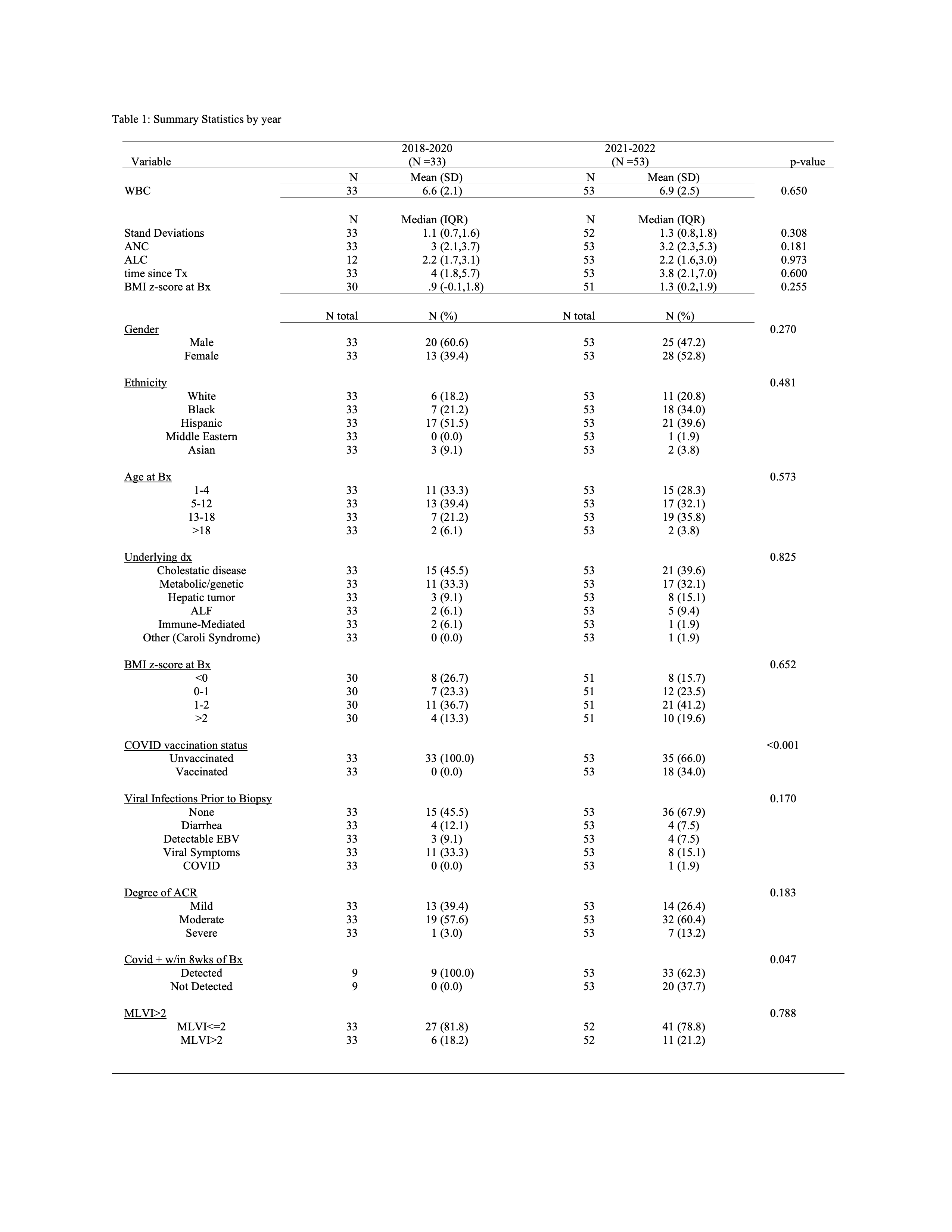 Results: Among the 621 transplanted patients followed at our institution, 25 and 28 children were diagnosed with ACR in 2021 and 2022, respectively, representing a 2.2 and 2.5-fold increase compared to the 3 preceding years (n=11 per year, 2018-2020). Diagnosis, sex, ethnicity, and body mass index z-score were similar between eras. Post-COVID, there was a 50% increase in ACR among adolescents with a higher trend in severe ACR (RAI >6), but no differences in median MLVI. WBC, ALC and ANC were no different. Viral infections were less common (p=0.045), but not associated with increased ACR in the post-COVID era. COVID vaccination status in the higher ACR cohort mirrored the same proportion of the total transplant cohort (34%), suggesting that COVID vaccination status plays little or no role in the increased incidence of ACR.