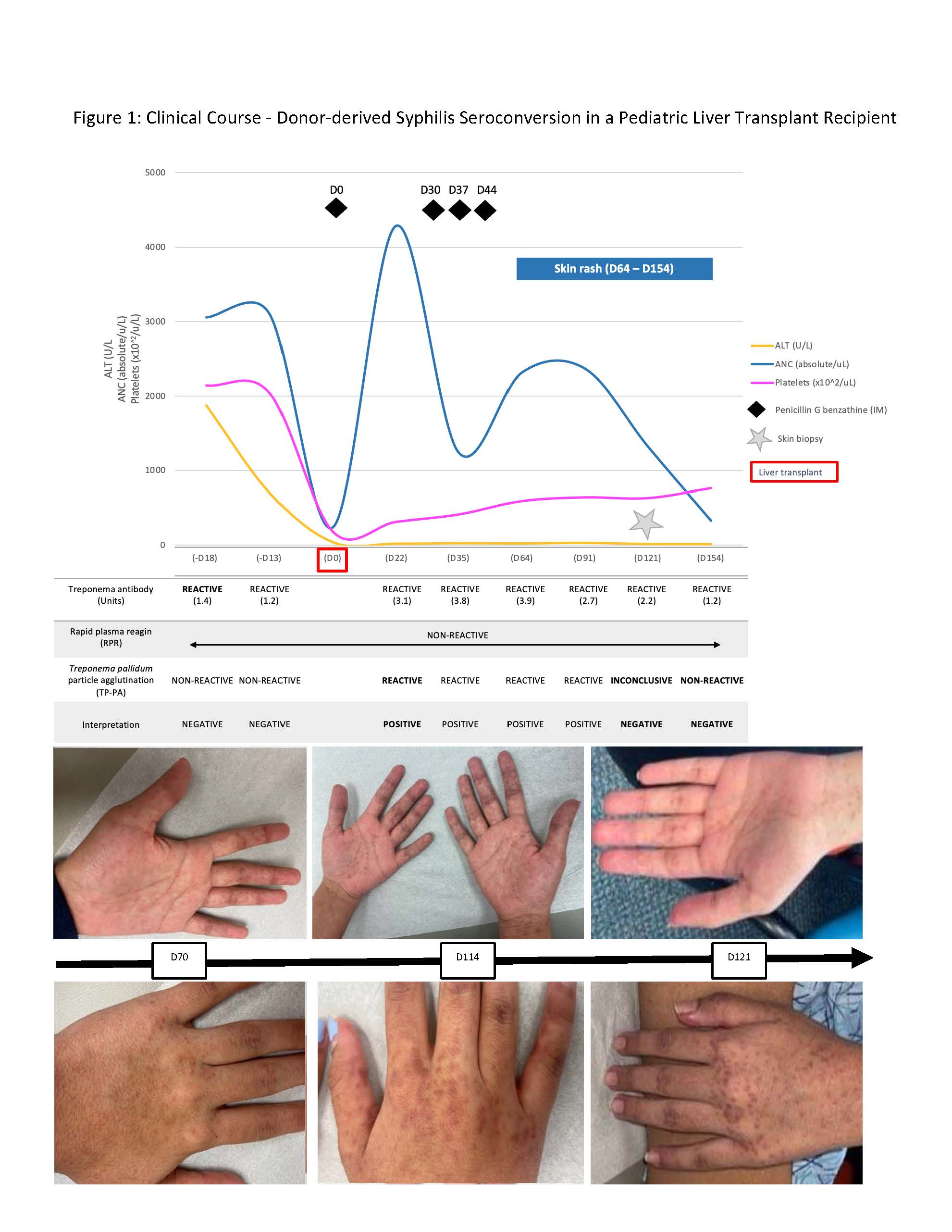 A previously healthy adolescent female with indeterminate acute liver failure underwent deceased-donor LT. The donor received penicillin for positive treponemal and non-treponemal syphilis testing (details unknown). Pre-transplant, recipient syphilis serologies were negative, and she received penicillin G benzathine (Pen-G) peri-operatively (Figure 1). She developed pancytopenia several days post-transplant, and bone marrow biopsy (D17) was suggestive of hepatitis-associated aplastic anemia. Repeat recipient syphilis testing was positive (D22); possible explanations included donor-derived infection, passive transfer of donor antibody, or transfer of antibody-producing donor B-lymphocytes. She received 3 weekly doses of Pen-G (D30, D37, D44). Around D64, she developed a maculopapular palmar and extremity rash reminiscent of secondary syphilis. Skin biopsy (D121) revealed perivascular dermatitis without other characteristic findings of syphilis or graft versus host disease (GVHD). Rash improved with topical steroids. On D154, TP-PA turned negative, suggesting positivity was due to donor antibody-producing B-lymphocytes that subsequently cleared. Chimerism testing revealed 55% donor T lymphocytes in blood (D161), raising concern for GVHD as the cause of rash and cytopenias.
