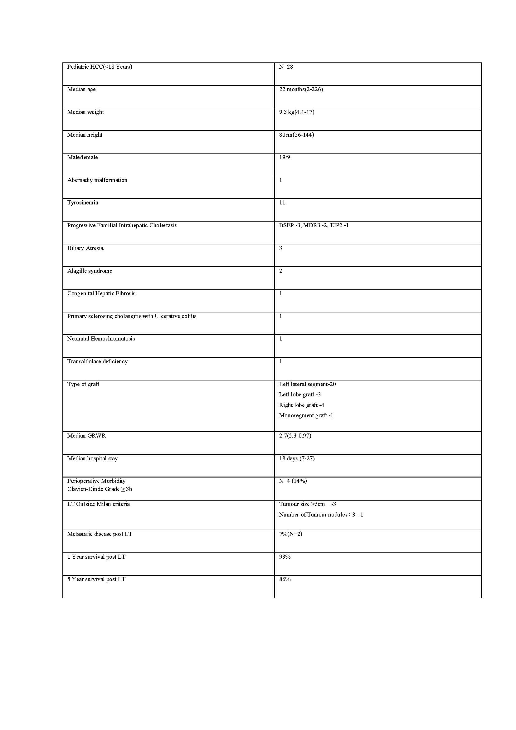Results: Of 650 pediatric LT, 33(5.1%) had a diagnosis of HCC. Five children had mixed tumours (hepatoblastoma with HCC component) and were excluded from the analysis. 22(78%) patients had an incidental diagnosis of HCC on explant liver histology, 4 underwent LT for Tyrosinemia and HCC, and 1 each for fibrolamellar HCC and Abernathy malformation. On application of Milan & UCSF criteria into the pediatric HCC cohort, 4 children had HCC beyond the criteria. Of whom 2 (50 %) developed metastatic disease following LT. The overall 1-year and 5-year disease-free survival following LT was 93% and 86% respectively.