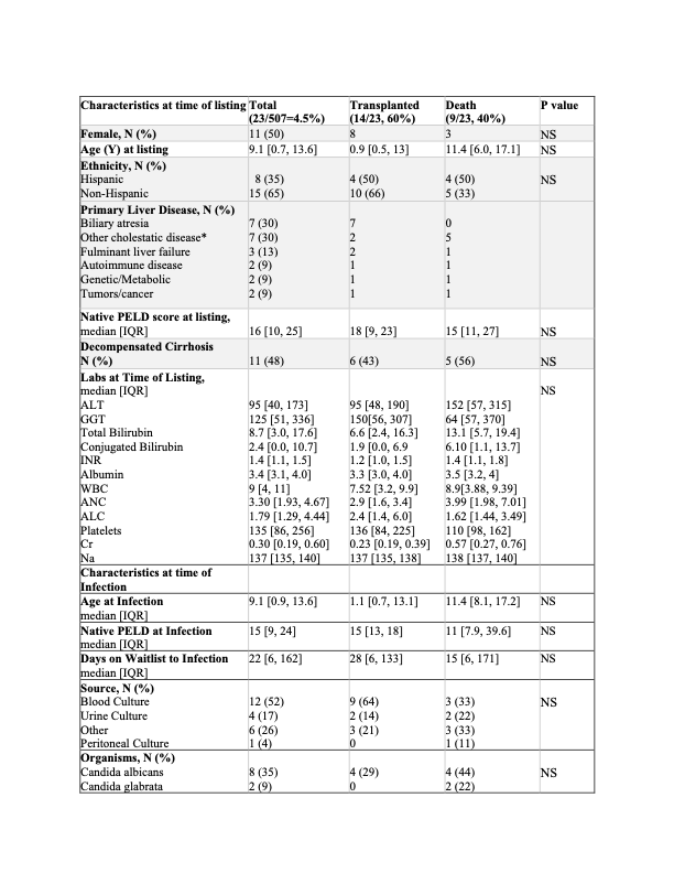 Results: 23/507 (4.5%) children listed for LT over 11-years had IFI; 9 (40%) children died. Patients who died were older (mean age: 11 years, IQR: 6.0, 17, p=0.09) than survivors, with a shorter median time from listing to IFI (15 days, IQR: 6, 171, p=0.28). Median time from infection to death was 11 days [IQR:10, 23]. There were no significant differences in listing indications, decompensated cirrhosis, or laboratory values at listing. Incidence of bacterial and viral infections, immunosuppression, and antibiotic exposure within the one-month preceding IFI were also similar amongst groups. Fungemia was the most common type of infection. Conjugated bilirubin, ANC, ALC, Cr and CRP at time of infection were significantly higher among the patients that died.